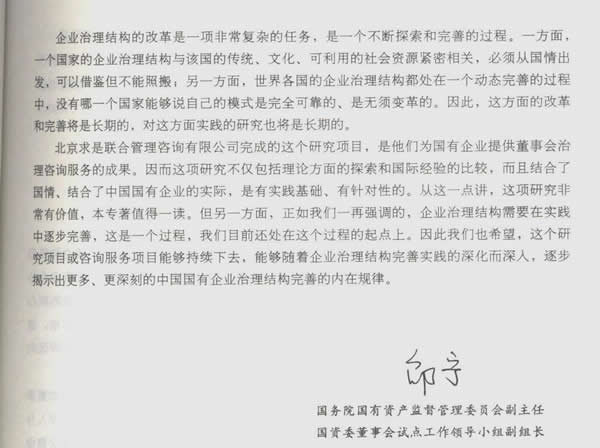 北京求是聯(lián)合管理咨詢有限公司完成的這個研究項目,是他們?yōu)閲衅髽I(yè)提供董事會治理咨詢服務的成果。因而這薦研究不公包括理論方面的探索和國際經(jīng)全的比較,而且結(jié)合了國情。結(jié)合了中國國有企業(yè)的實際不,是有實踐基礎(chǔ)、有針對性的、從這一點講,這項研究非常有價值,本專著值得一讀。但另一方面,正臺我們一再強調(diào)的,企業(yè)治理結(jié)構(gòu)需要在實踐中逐步完善,這是一個過程,我們目前還處在這個過程的起點上。因此我們也希望,這個研究項目或咨詢服務項目能夠持續(xù)下去,能夠隨著企業(yè)的治理結(jié)構(gòu)完善實踐的深化而入,逐步揭示出更多、更深刻的中國國有企業(yè)治理結(jié)構(gòu)完善的內(nèi)在規(guī)律。