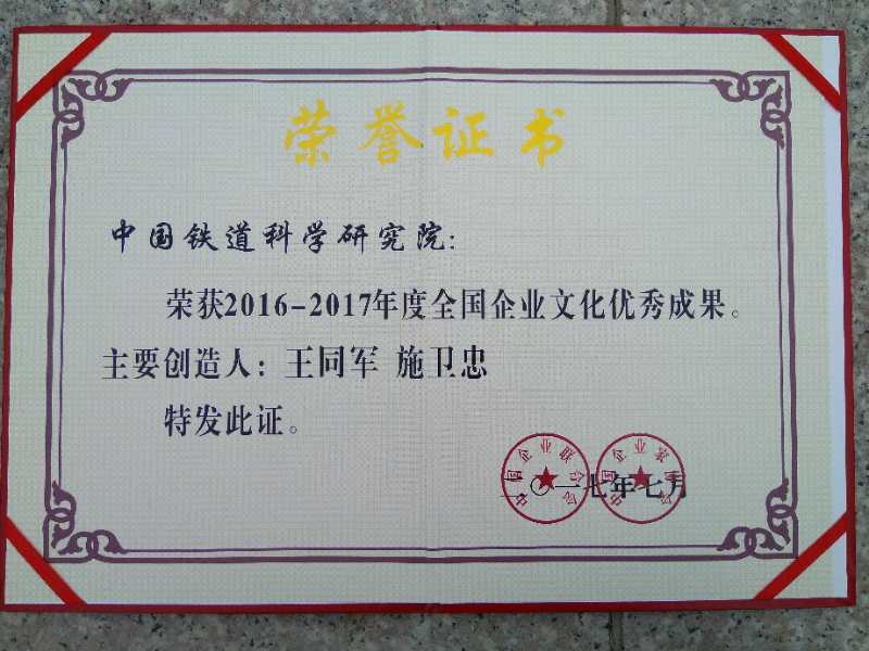 7月22日,由中國企業(yè)聯(lián)合會、中國企業(yè)家協(xié)會主辦的2017全國企業(yè)文化年會在北京隆重舉行。本次年會以“弘揚(yáng)優(yōu)秀文化引領(lǐng)創(chuàng)新發(fā)展”為主題,公布并表彰了2016-2017年度全國企業(yè)文化突出貢獻(xiàn)人物、全國企業(yè)文化優(yōu)秀案例和全國企業(yè)文化優(yōu)秀成果企業(yè)。中國鐵道科學(xué)院授予“2016-2017年度全國企業(yè)文化優(yōu)秀成果”獎,該成果源于求是咨詢?yōu)槠涑闪?5周年所總結(jié)提煉提升的企業(yè)文化咨詢。