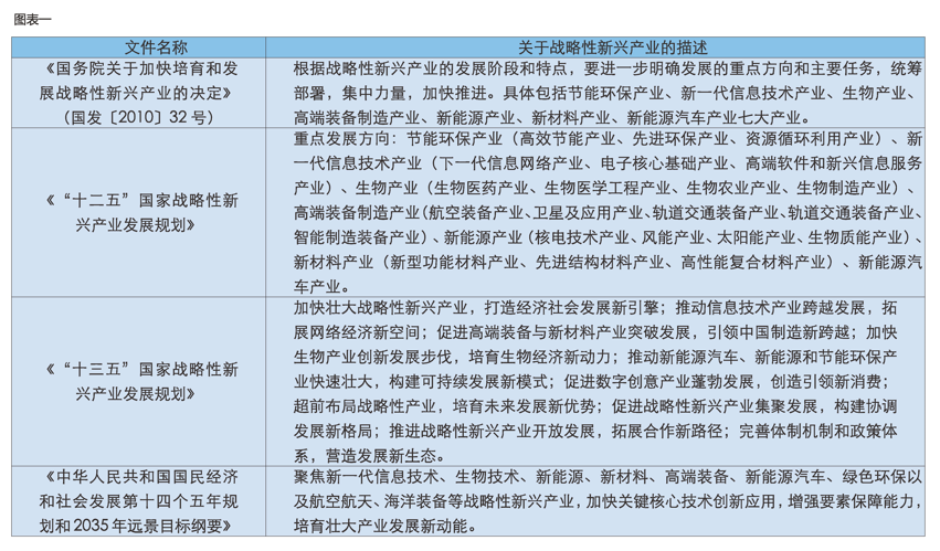 戰(zhàn)略性新興產(chǎn)業(yè)的發(fā)展規(guī)劃始于《國務(wù)院關(guān)于加快培育和發(fā)展戰(zhàn)略性新興產(chǎn)業(yè)的決定》(國發(fā)〔2010〕32號),最初涉及七大產(chǎn)業(yè);自“十二五”規(guī)劃以來,連續(xù)三個五年規(guī)劃中都提及發(fā)展戰(zhàn)略性新興產(chǎn)業(yè)。(詳見圖表一)