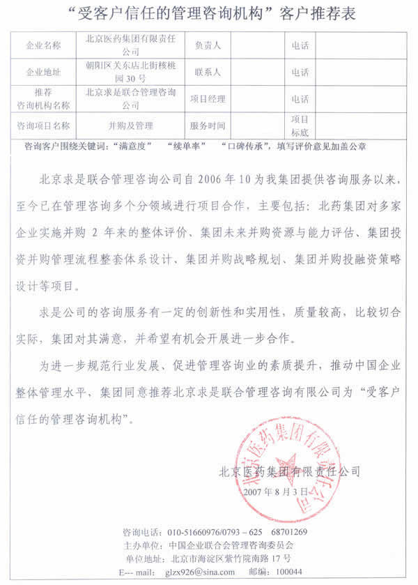 北京求是聯(lián)合管理咨詢(xún)公司自2006年10月為我集團(tuán)提供咨詢(xún)服務(wù)以來(lái),至今已在管理咨詢(xún)多個(gè)分領(lǐng)域進(jìn)行項(xiàng)目合作,主要包括:北藥集團(tuán)對(duì)多家企業(yè)實(shí)施并購(gòu)2年來(lái)的整體評(píng)價(jià),集團(tuán)未來(lái)并購(gòu) 資源與能力評(píng)估、集團(tuán)投資并購(gòu)管理流程整套體系設(shè)計(jì),集團(tuán)并購(gòu)戰(zhàn)略規(guī)劃、集團(tuán)并購(gòu)?fù)顿Y融資策略設(shè)計(jì)等項(xiàng)目。