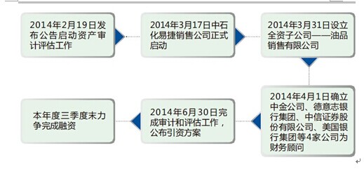 今年4月1日,中國石化將所屬油品銷售業(yè)務(wù)資產(chǎn)整體移交給銷售公司擁有、管理和控制。將31家省級分公司及其管理的長期股權(quán)投資、中國石化燃料油銷售有限公司、中國石化(香港)有限公司、中國石化(香港)航空燃油有限公司的業(yè)務(wù)、資產(chǎn)、人員全部注入到銷售公司。4月24日,確定中金公司、德意志銀行集團(tuán)、中信證券股份有限公司、美國銀行集團(tuán)等4家公司為財務(wù)顧問。