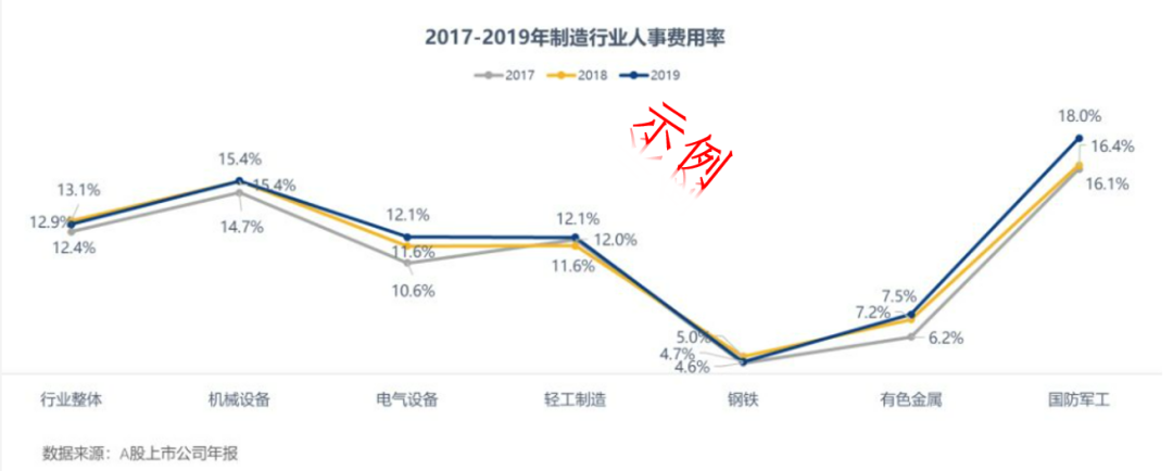 例如通過對2017年-2019年制造行業(yè)A股上市公司年報做分析,可以發(fā)現(xiàn)制造行業(yè)整體人事費用率略有上漲,從12.4%增長至12.9%,且各個細(xì)分行業(yè)的人事費用率也能進行分析。