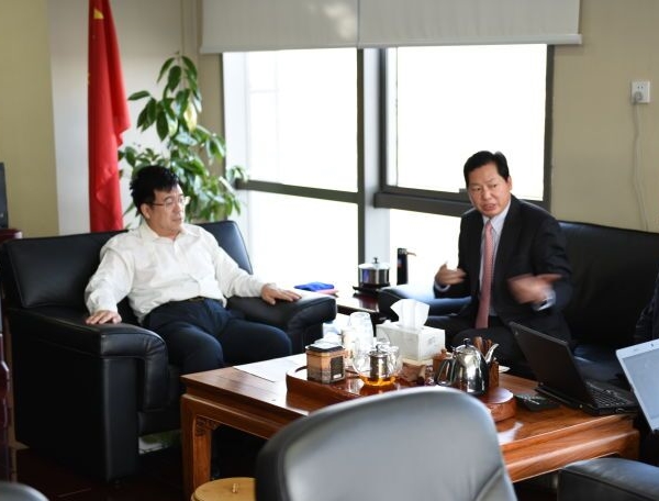 圖為中華聯(lián)合保險(xiǎn)控股有限公司董事長(zhǎng)陳景耀博士(左一)在接受我司董事長(zhǎng)安林博士(左二)等項(xiàng)目組專家的訪談。