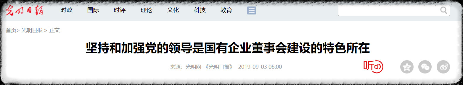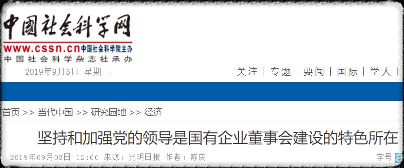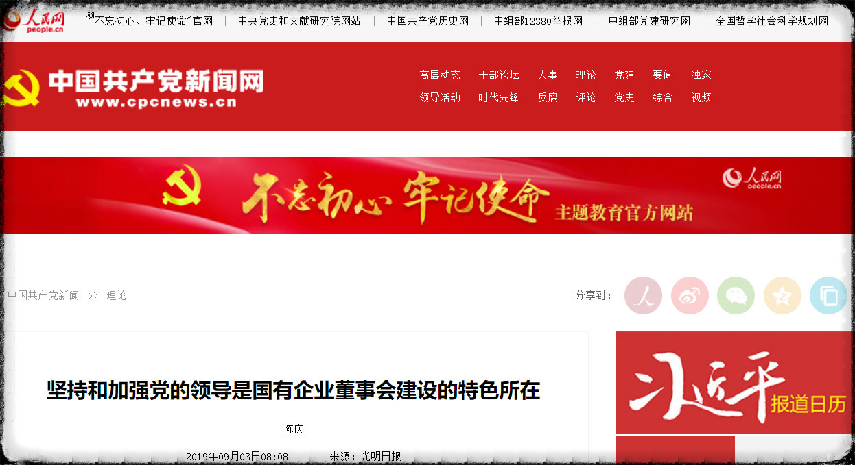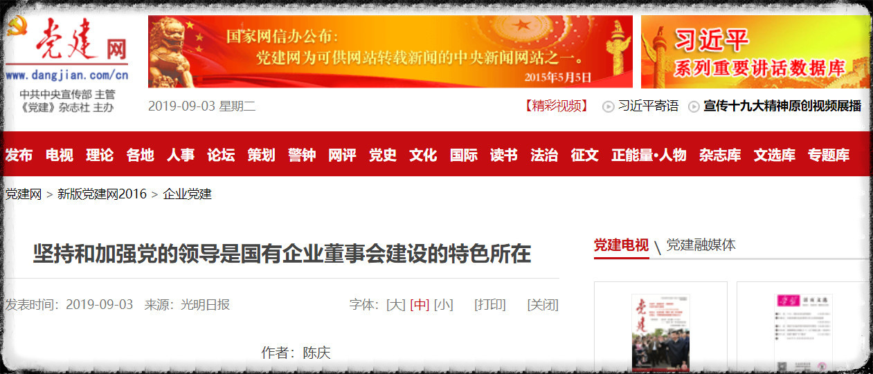 2019年9月3日,《光明日?qǐng)?bào)》經(jīng)濟(jì)學(xué)理論版刊發(fā)了求是咨詢(xún)總經(jīng)理、首都經(jīng)濟(jì)貿(mào)易大學(xué)工商管理學(xué)院副教授陳慶博士《堅(jiān)持和加強(qiáng)黨的領(lǐng)導(dǎo)是國(guó)有企業(yè)董事會(huì)建設(shè)的特色所在》的署名文章。陳慶博士結(jié)合求是咨詢(xún)多年黨建咨詢(xún)經(jīng)驗(yàn)和研究成果,清晰梳理了國(guó)有企業(yè)董事會(huì)建設(shè)在試點(diǎn)、規(guī)范和完善等不同階段黨組織地位變化的發(fā)展邏輯,創(chuàng)造性地提出:黨組織在公司法人治理中法定地位的確立,實(shí)現(xiàn)了中國(guó)特色國(guó)有企業(yè)董事會(huì)建設(shè)的理論創(chuàng)新。文章被光明網(wǎng)、人民網(wǎng)、國(guó)務(wù)院國(guó)有資產(chǎn)管理委員會(huì)、黨建網(wǎng)等多家官媒、網(wǎng)站轉(zhuǎn)載。