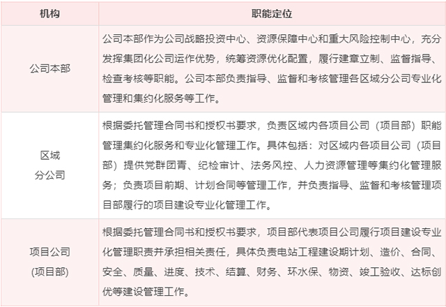 項(xiàng)目公司設(shè)“四會(huì)一層”,通過股東會(huì)、黨組織會(huì)、董事會(huì)、監(jiān)事會(huì)、總經(jīng)理辦公會(huì)進(jìn)行決策,項(xiàng)目建設(shè)期間項(xiàng)目公司不設(shè)管理部門,到一定階段設(shè)生產(chǎn)準(zhǔn)備部門,到項(xiàng)目竣工投產(chǎn)時(shí)再配相關(guān)部門;區(qū)域分公司設(shè)“一會(huì)一層”,通過黨委會(huì)、總經(jīng)理辦公會(huì)進(jìn)行決策,設(shè)若干職能部門和業(yè)務(wù)部門進(jìn)行日常管理;項(xiàng)目部設(shè)“一會(huì)一層”,通過黨支部會(huì)、總經(jīng)理辦公會(huì)進(jìn)行決策,設(shè)若干業(yè)務(wù)部門和職能部門進(jìn)行日常管理。