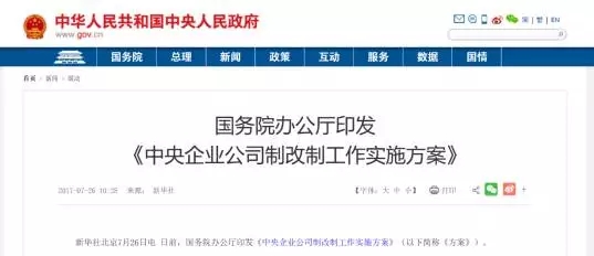 《方案》給出了明確時間表:2017年年底前,除中央金融、文化企業(yè)外,按照全民所有制工業(yè)企業(yè)法登記、國資委監(jiān)管的中央企業(yè)全部改制為按照公司法登記的有限責(zé)任公司或股份有限公司。