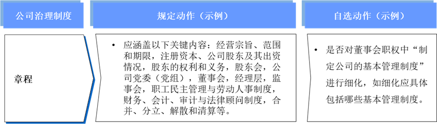 以中央企業(yè)(國有全資/控股公司)為例,《公司法》、《中央企業(yè)公司章程指引(試行)(國有全資/國有控股公司)》對公司《章程》的內容,以及各公司治理主體的職權、會議召開、決策方式等提出了具體要求,這些屬于“規(guī)定動作”;在這些具體要求之外,企業(yè)結合實際情況對各公司治理主體職權等進行細化或補充完善,則屬于“自選動作”。