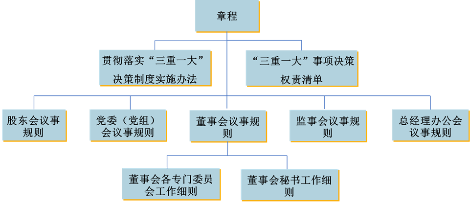 公司《章程》之外,企業(yè)還需要制定《股東會議事規(guī)則》、《黨委(黨組)會議事規(guī)則》、《董事會議事規(guī)則》、董事會各專門委員會工作細則、《監(jiān)事會議事規(guī)則》、《總經(jīng)理辦公會議事規(guī)則》、《董事會秘書工作細則》、《貫徹落實“三重一大”決策制度實施辦法》、《“三重一大”事項決策權責清單》等配套公司治理制度,對各治理主體職權、組織機構、會議召開要求、議決程序、會議記錄、決議的執(zhí)行等進行細化。