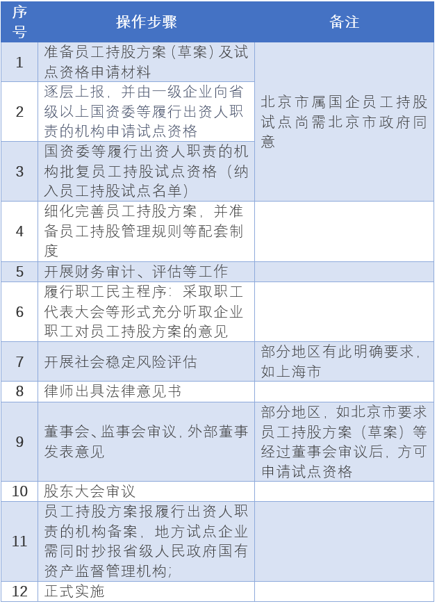 根據(jù)“133號文”和北京市國資委印發(fā)的《關(guān)于市屬國有控股混合所有制企業(yè)開展員工持股試點的實施辦法》(京國資發(fā)〔2016〕21號),本文將國有背景企業(yè)員工持股的一般操作流程歸納如下:(在具體要求上,各地可能略有不同)