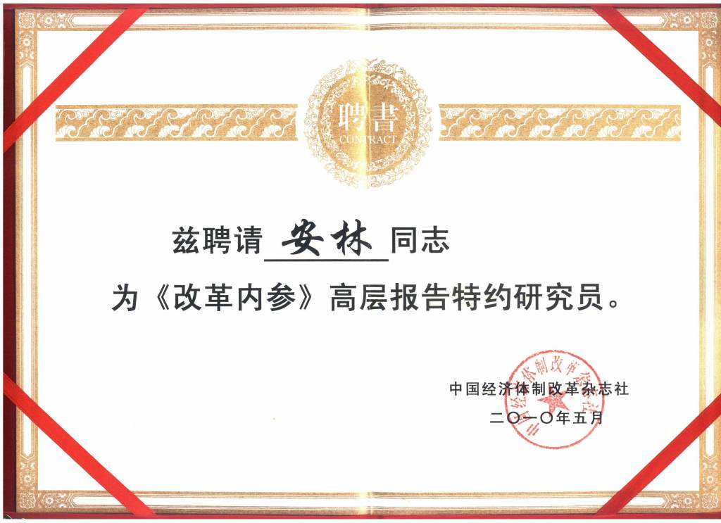 2011年9月4日,由中國經(jīng)濟(jì)體制改革雜志社、《改革內(nèi)參》高層報(bào)告編輯部主辦的“《改革內(nèi)參》高層報(bào)告特約專家/研究員首屆會(huì)議”,在北京友誼賓館嘉賓樓隆重舉行。我司董事長安林博士作為中國國資與國企改革咨詢研究專家,被聘為《改革內(nèi)參》高層報(bào)告特約研究員。