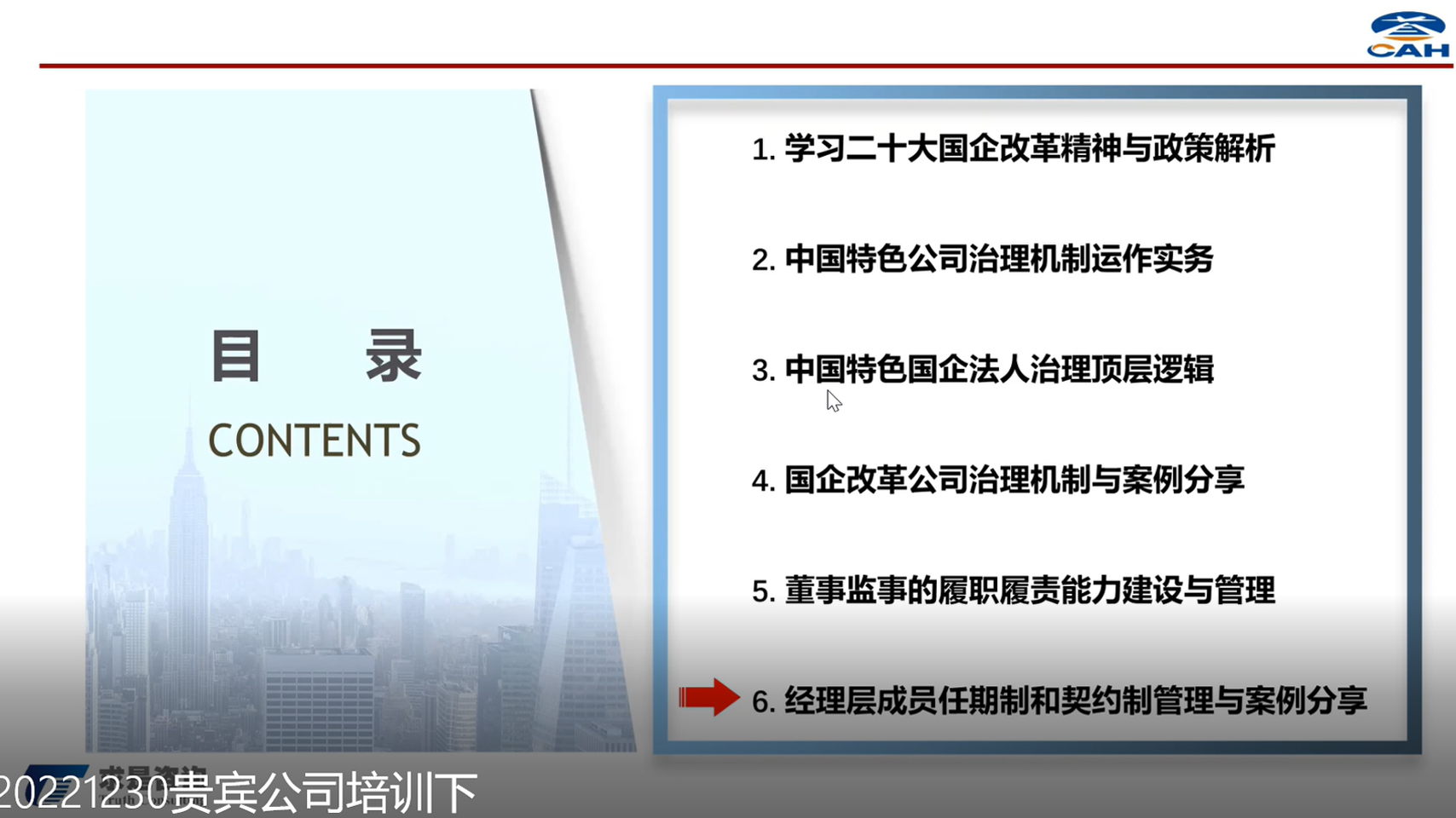 陳慶博士應(yīng)貴賓公司需求,定向開發(fā)了此次講座,內(nèi)容包括:學(xué)習(xí)二十大國企改革精神與政策解析、中國特色公司治理機(jī)制運(yùn)作實(shí)務(wù)、中國特色國企法人治理頂層邏輯、國企改革公司治理機(jī)制與案例分享、董事監(jiān)事的履職履責(zé)能力建設(shè)與管理和經(jīng)理層成員任期制與契約化管理與案例分享等六個(gè)方面。講座內(nèi)容博大精深、干貨滿滿,獲得貴賓公司領(lǐng)導(dǎo)及參訓(xùn)人員的高度認(rèn)可和評(píng)價(jià)。