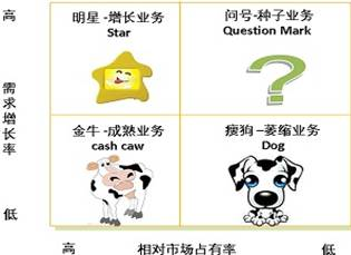 業(yè)務組合的傳統(tǒng)設計所依據(jù)的經(jīng)典理論,最為人們所熟悉的首先當屬波士頓矩陣。波士頓矩陣以縱軸的市場吸引力和橫軸的業(yè)務競爭能力來劃分出四個象限,用以得出企業(yè)所擁有的業(yè)務取舍的決策。其中,市場引力選用的指標是市場需求的增長速度,而業(yè)務競爭力的衡量指標是該業(yè)務所占有的市場份額大小。