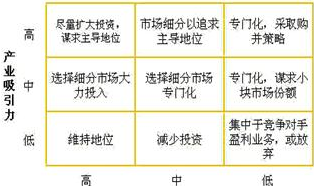 上世紀70年代,美國通用公司在波士頓矩陣的基礎上,開發(fā)出了著名的通通用矩陣。通用矩陣與波士頓矩陣的主要區(qū)別在于,其將坐標軸的指標由單一的“需求增長率—市場占有率”改進成了指標集合,用更多的指標來衡量著兩個維度,此外,中間添加了中間等級。通過引入更多的指標,通用矩陣顯然比波士頓矩陣更為準確,考慮的問題更為周全,并且,由于添加了中間等級,對于業(yè)務競爭策略不再像波士頓矩陣那樣殘酷——要么成功、要么被清算,而商業(yè)競爭本身就不是一個能夠定量確定的領域,很多時候很難畫出兩者之間的那根線。