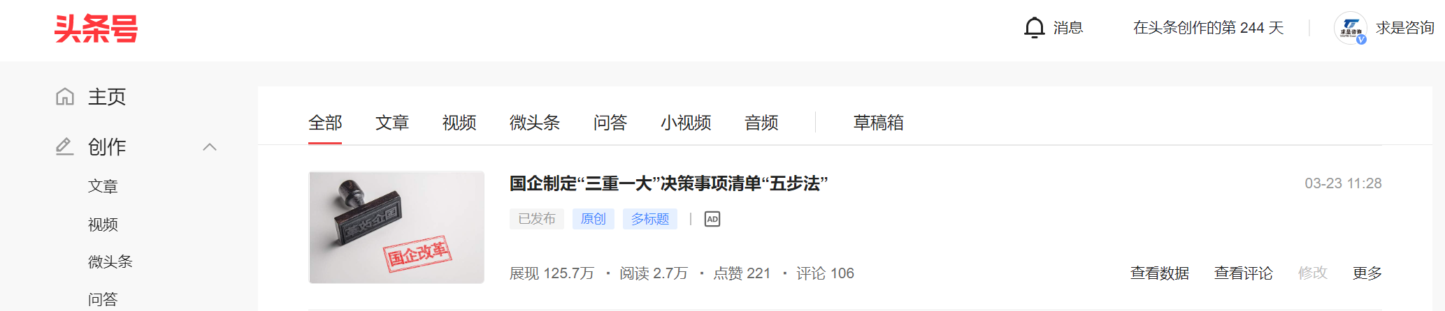 9. 發(fā)表《今日頭條》文章:《國企業(yè)制定“三重一大”決策事項清單“五步法”》,獲得社會企業(yè)人士好評。