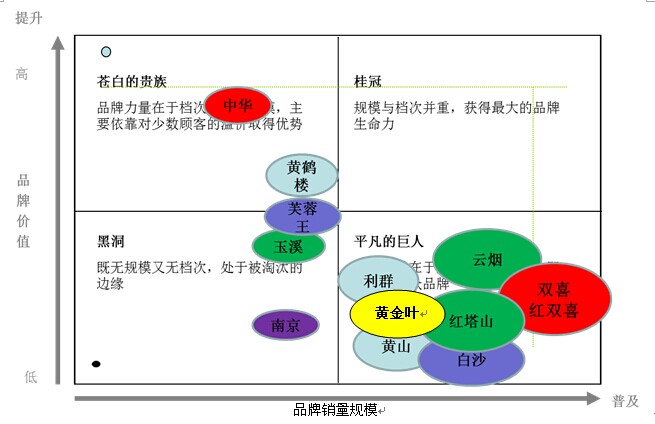 云煙、紅塔山、雙喜、白沙、黃山、利群、黃金葉等品牌銷量大品牌價值相對不高屬于平凡的巨人,利群、黃金葉和黃山的重點是提高銷量,培育品牌,提高品牌價值。云煙、紅塔山、白沙、雙喜重點是提高品牌價值,提高銷量空間比較小。