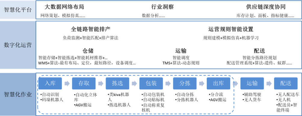 目前,智慧物流主要包括智慧化平臺、數字化運營以及智能化作業(yè)三大應用框架,可結合市場需求、行業(yè)發(fā)展趨勢、企業(yè)資源優(yōu)勢、現有業(yè)務布局情況以及科技水平,加強相關細分領域布局。
