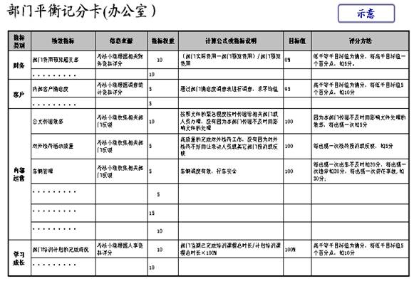 我們可參考上述幾個(gè)關(guān)鍵點(diǎn)來(lái)編制部門(mén)平衡計(jì)分卡。員工層面的平衡計(jì)分卡設(shè)立則是結(jié)合部門(mén)平衡計(jì)分卡和員工崗位職責(zé)來(lái)進(jìn)行。