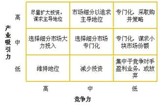 上世紀70年代,美國通用公司在波士頓矩陣的基礎(chǔ)上,開發(fā)出了著名的通通用矩陣。通用矩陣與波士頓矩陣的主要區(qū)別在于,其將坐標軸的指標由單一的“需求增長率—市場占有率”改進成了指標集合,用更多的指標來衡量著兩個維度,此外,中間添加了中間等級。通過引入更多的指標,通用矩陣顯然比波士頓矩陣更為準確,考慮的問題更為周全,并且,由于添加了中間等級,對于業(yè)務(wù)競爭策略不再像波士頓矩陣那樣殘酷——要么成功、要么被清算,而商業(yè)競爭本身就不是一個能夠定量確定的領(lǐng)域,很多時候很難畫出兩者之間的那根線。